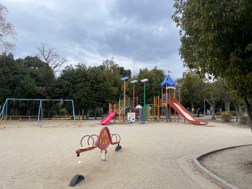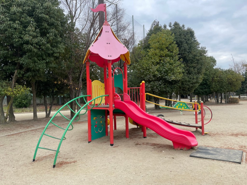 さて、先ほどの入り口を進んでいくと、同公園内にある豊中ローズ球場を左手に見ながら、進んでいくと、遊具の広場へと続いています